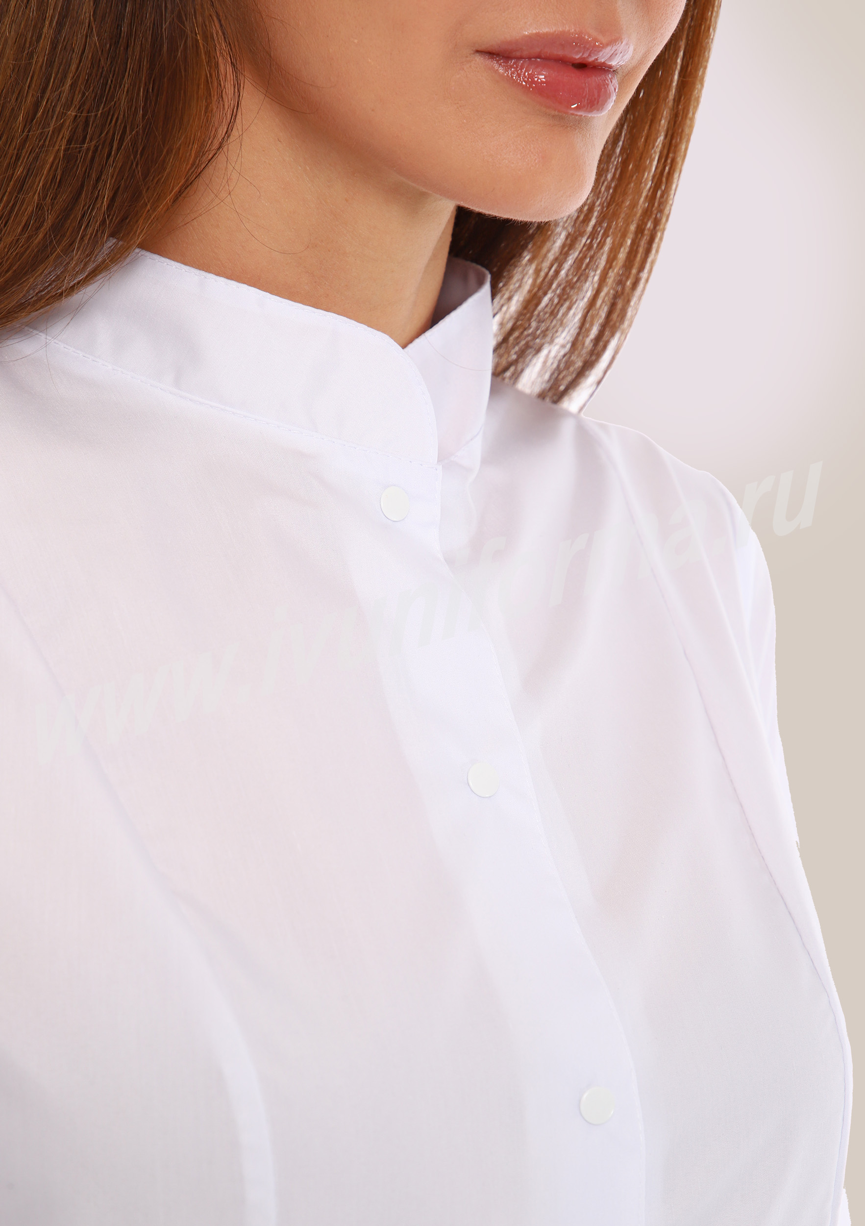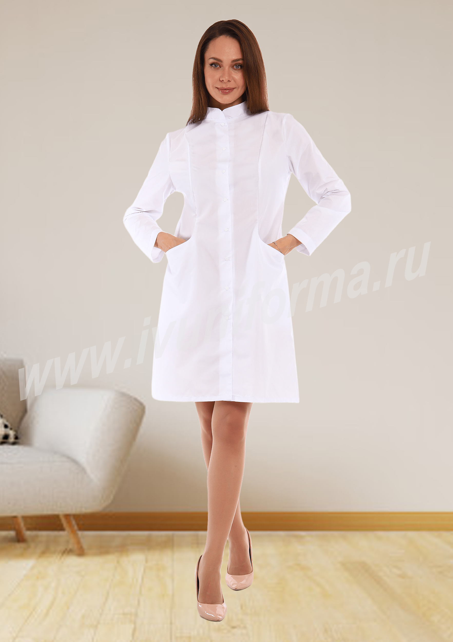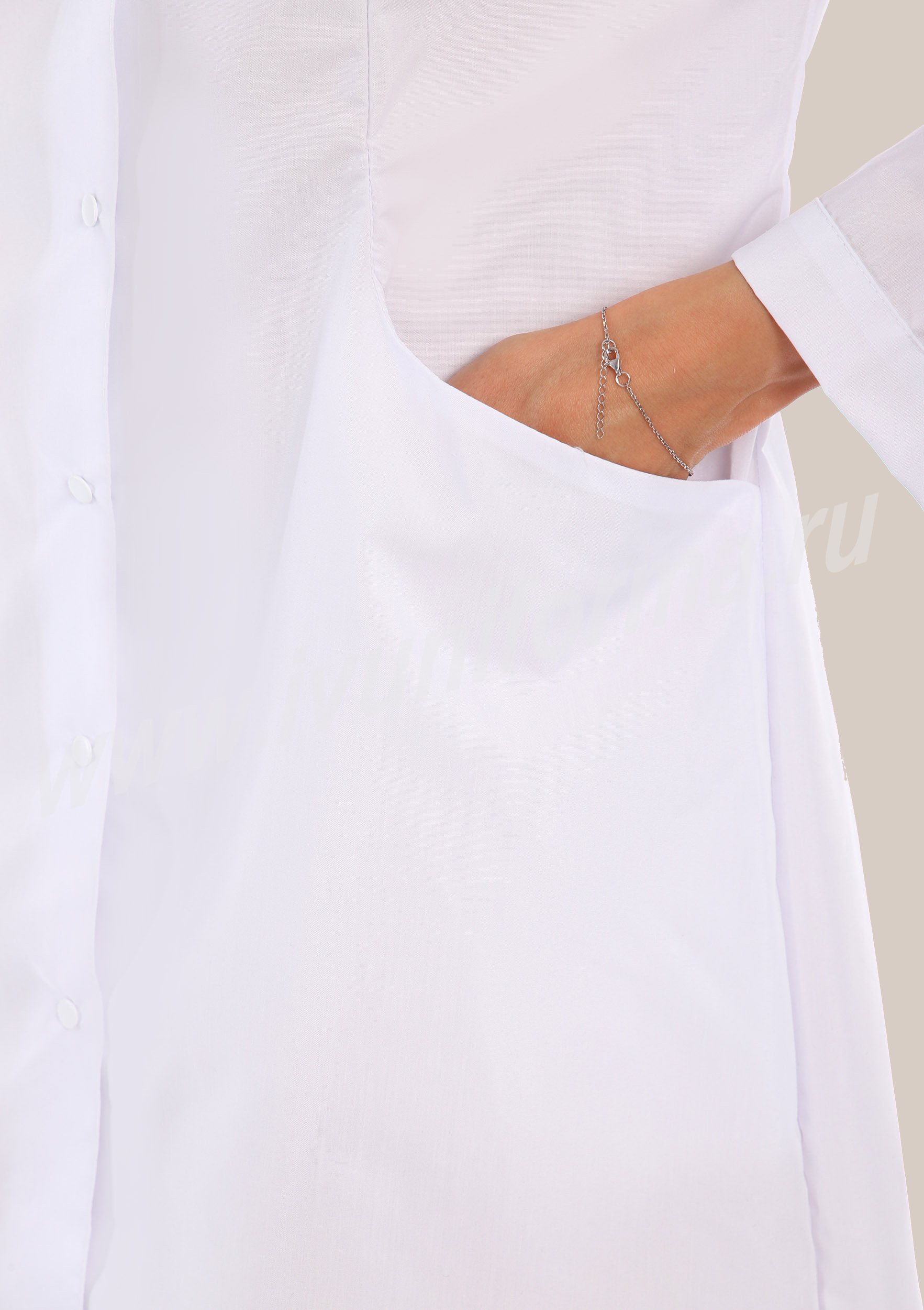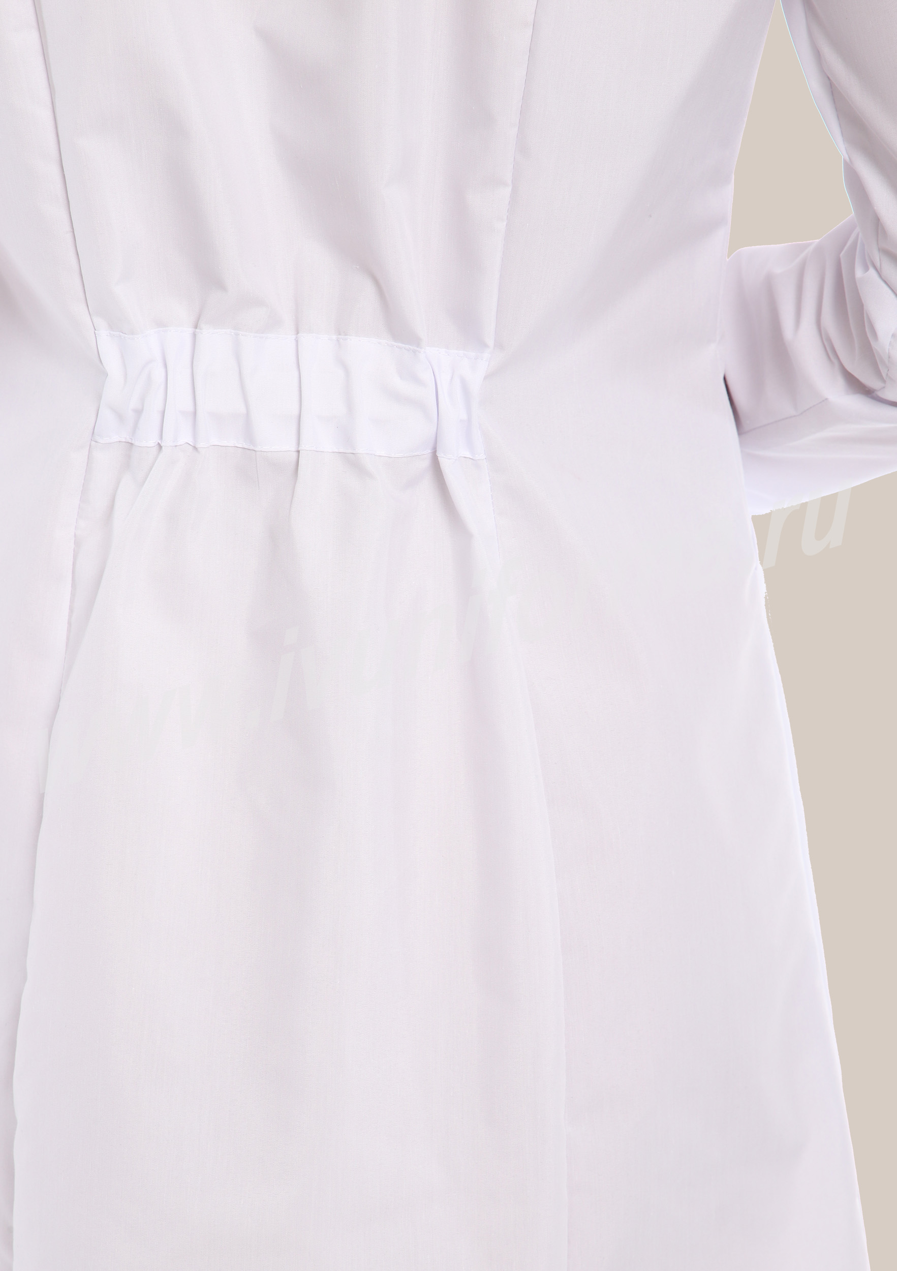 Халат медицинский женский средней длины, прилегающего силуэта с центральной бортовой застежкой на кнопки. Комфортная посадка на фигуре обеспечивается за счет рельефов, выходящих из плечевых швов на полочке и спинке. Аккуратный воротник-стойка, внутренние карманы в рельефном шве придают изделию простоту и элегантность. Линию талии в центральной части спинки эффектно подчеркивает эластичный пояс. Рукав втачной, длинный. Халат прекрасно подойдет для тех, кто ценит простоту, практичность и комфорт.