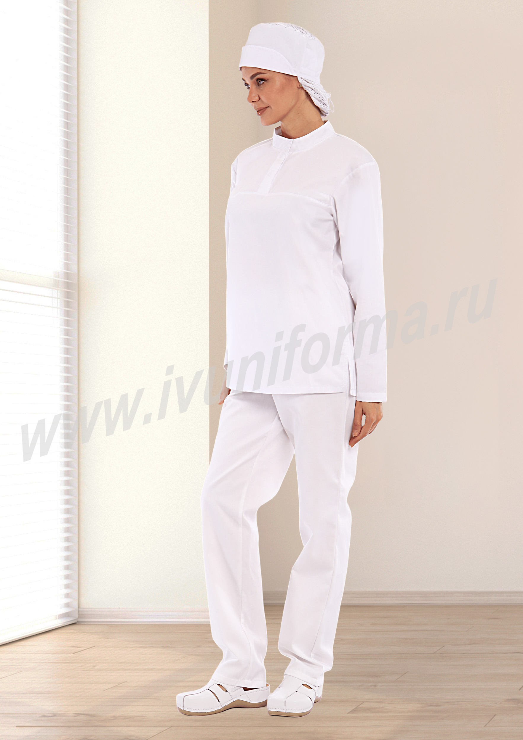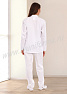 Костюм женский состоит из куртки и брюк. Куртка удлиненная прямого силуэта с центральной потайной застежкой на две кнопки. Полочка с нагрудными вытачками, с отрезными кокетками. Спинка прямая. Рукав втачной длинный, прилегание рукава по низу регулируется кнопками. Воротник стойка с потайной застежкой на кнопку обеспечивает изоляцию кожных покровов в области шеи. В боковых швах куртки предусмотрены разрезы для легкого доступа в карманы брюк. Брюки прямые на эластичном поясе со вставкой для комфортной посадки на талии и верхними боковыми карманами с наклонным входом. Костюм выполнен из смесовой износоустойчивой ткани, с повышенным содержанием хлопка, что полностью соответветствует требованиям к одежде для пищевой промышленности, лаборантов и фармацевтов. Костюм предназначен для защиты от общих производственных загрязнений. Модель разработана в соответствии с международными требованиями безопасности пищевого производства согласно системе НАССР (ХАССП).