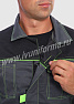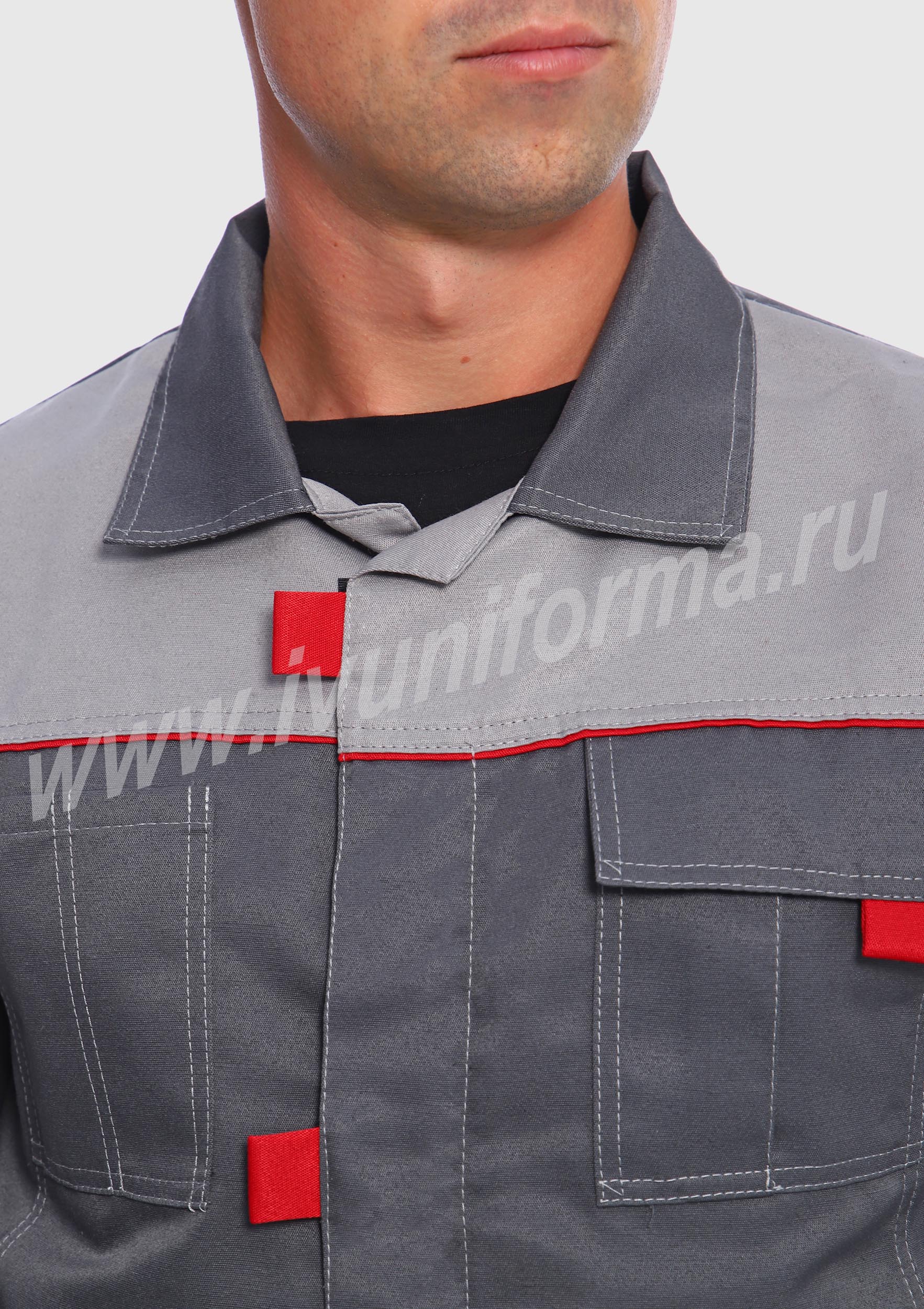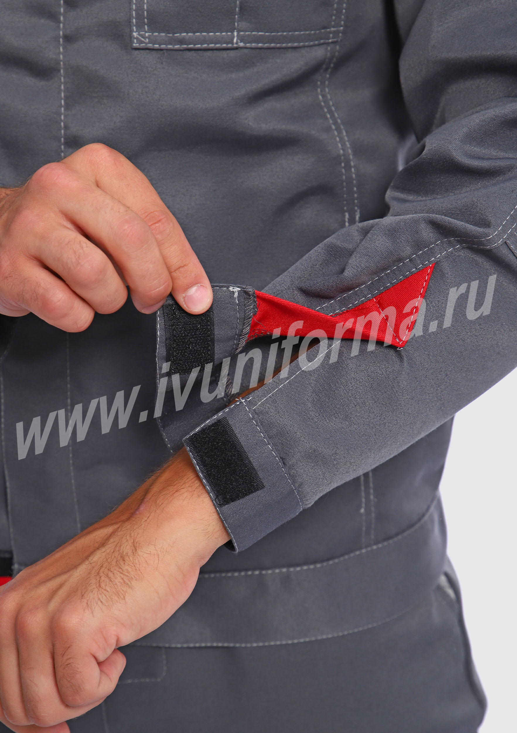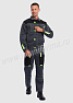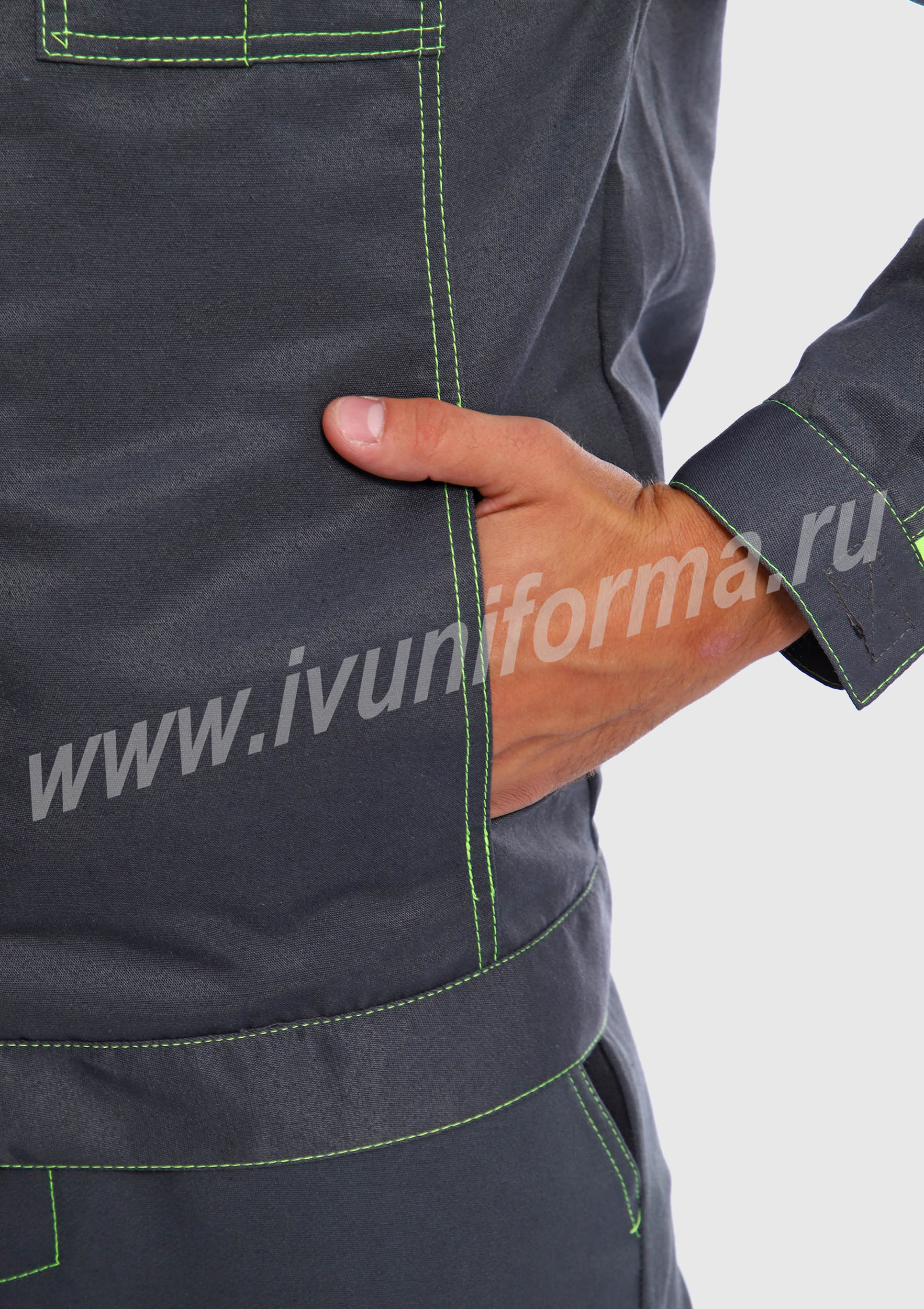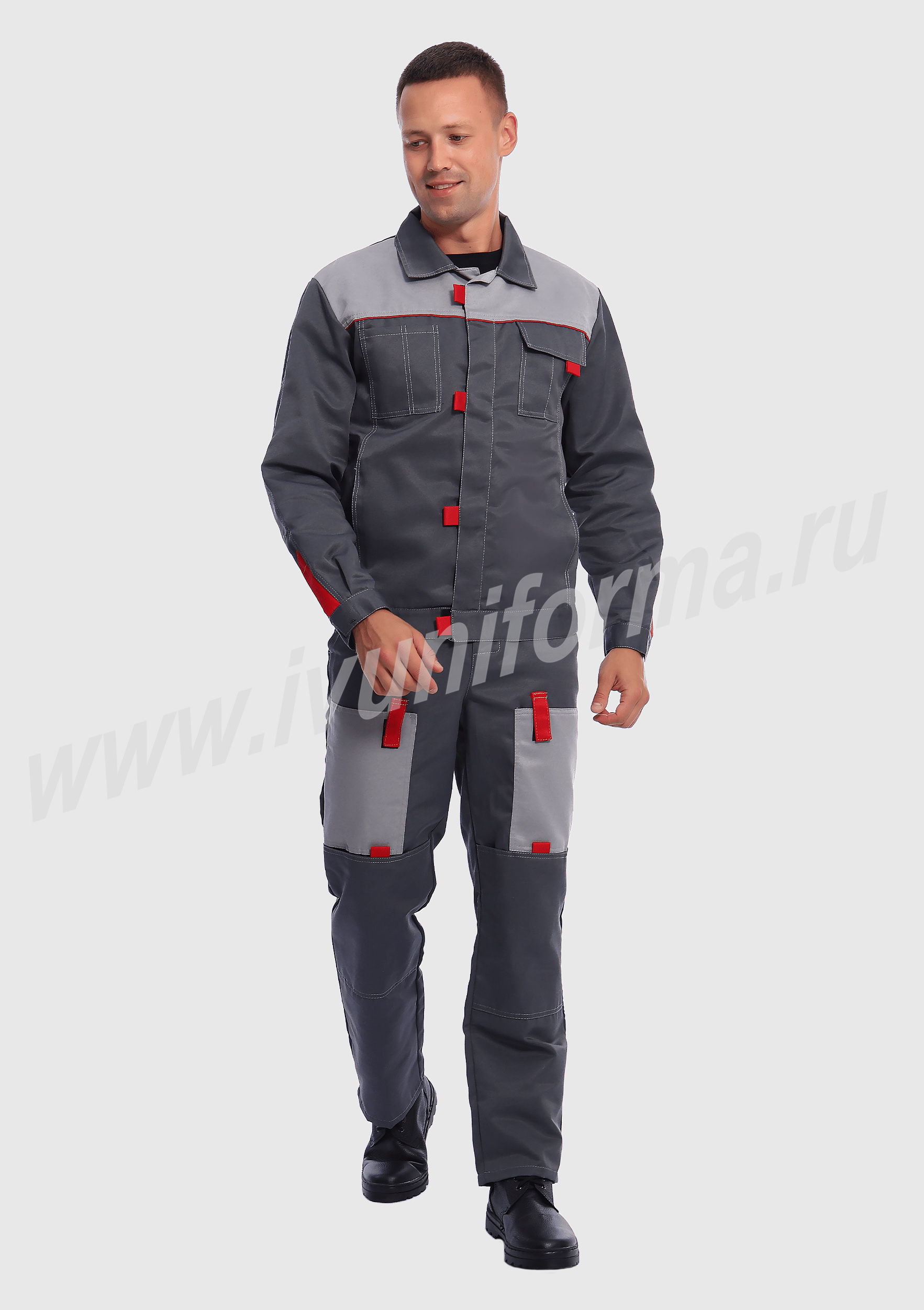 Костюм рабочий мужской состоит из куртки и полукомбинезона. Куртка с притачным поясом, стянутым по бокам эластичной лентой, с отложным воротником, с потайной застежкой на молнию, с нагрудным и двумя накладными боковыми карманами. Полукомбинезон с накладными и нагрудным карманами. Костюм усилен налокотниками и наколенниками, предназначен для защиты от общепроизводственных загрязнений и производственных травм.