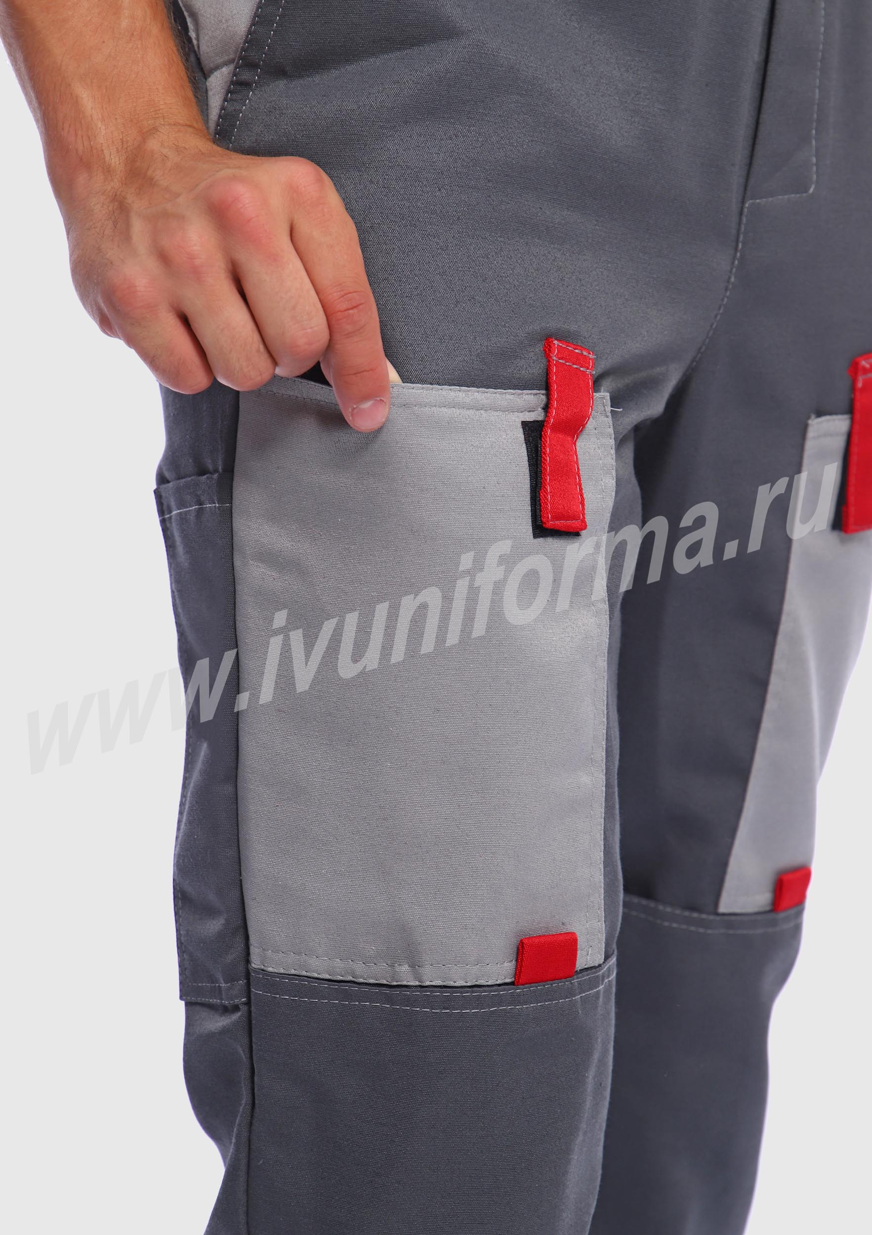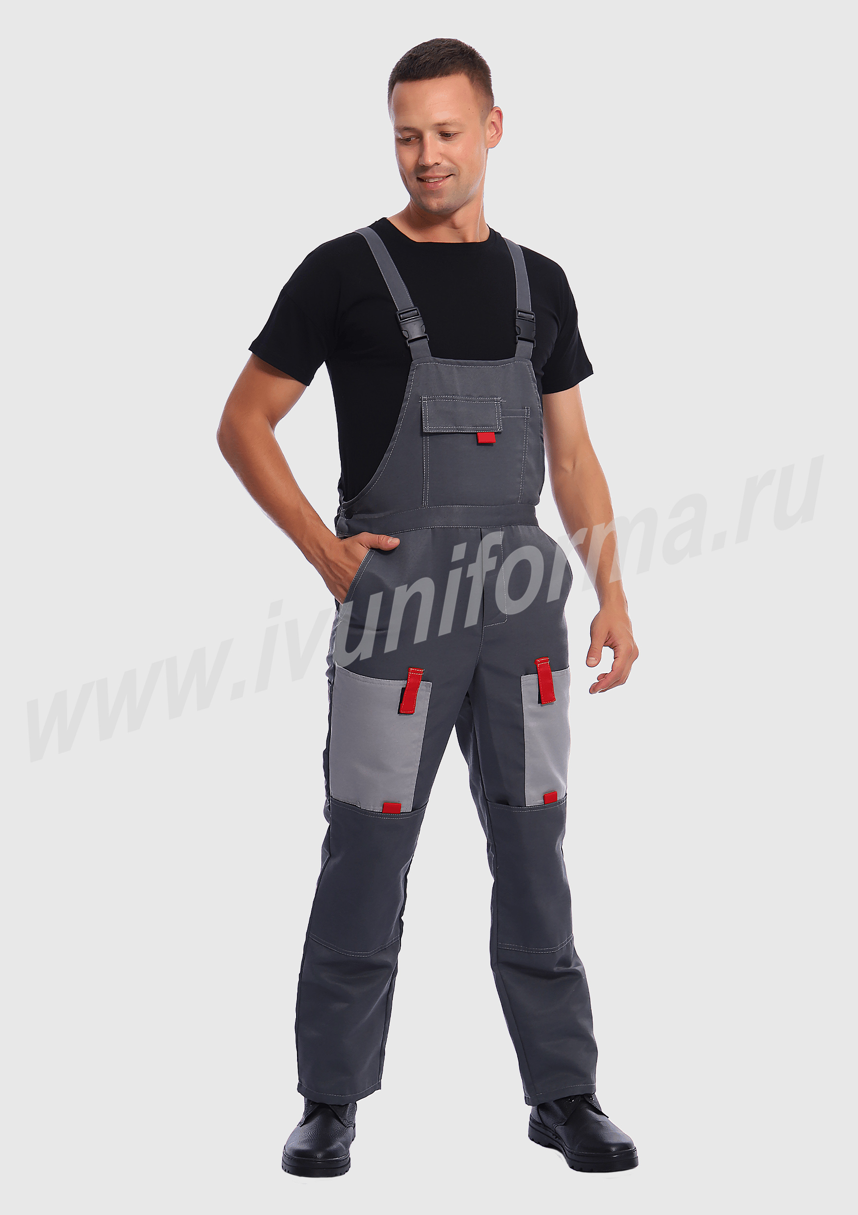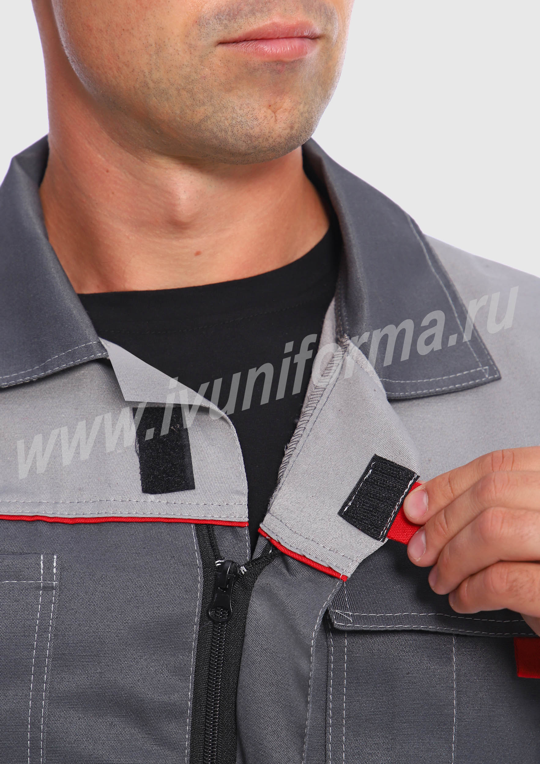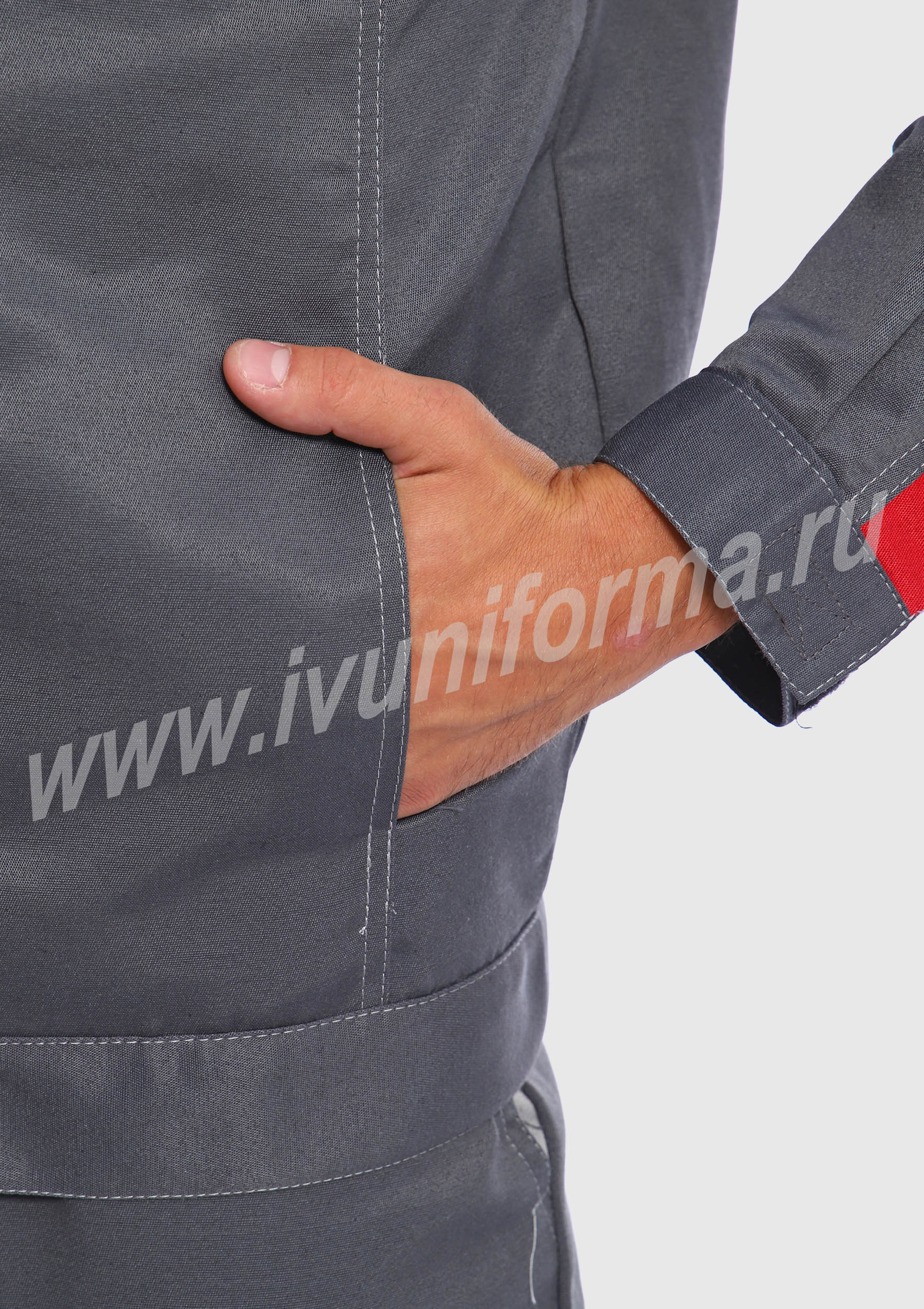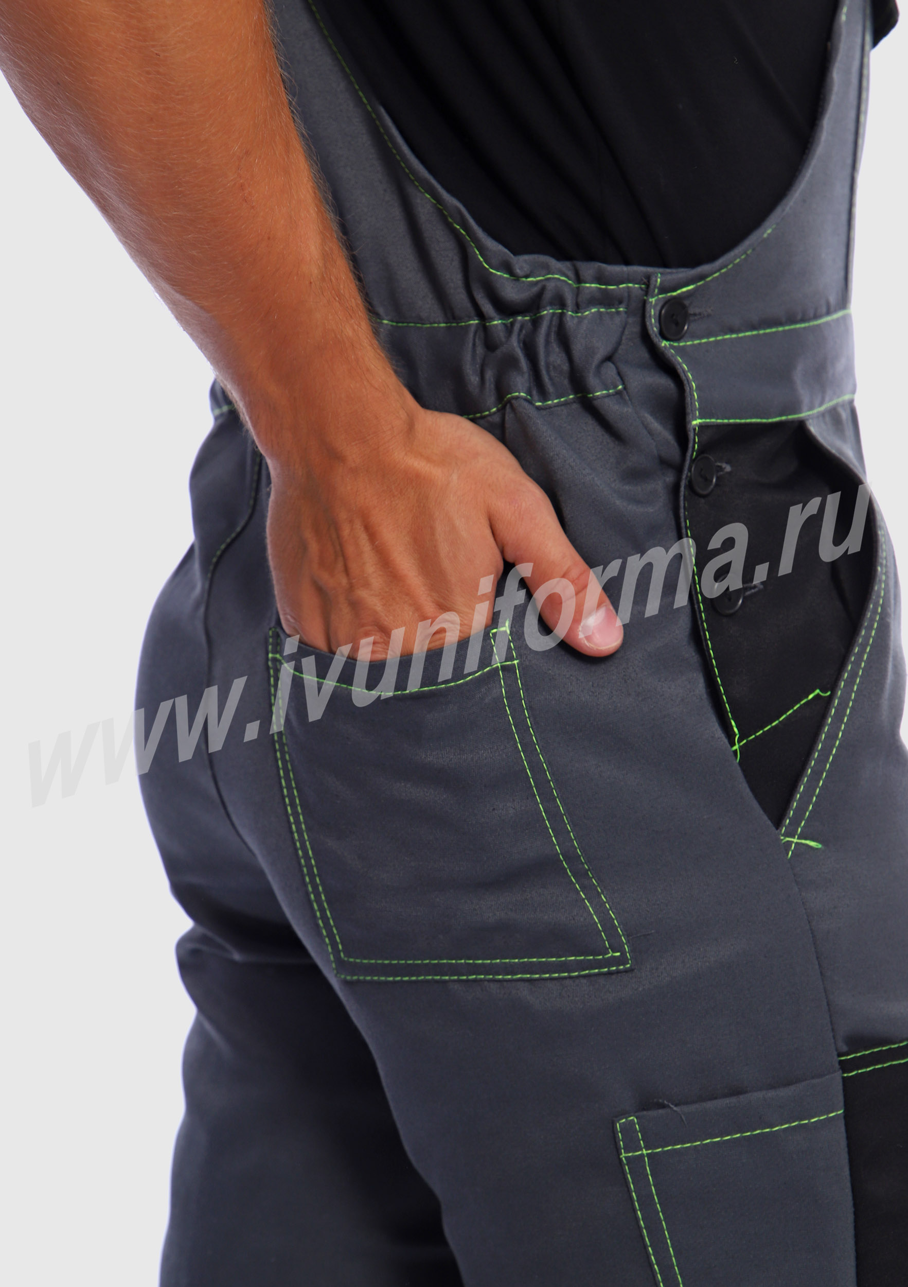 Костюм рабочий мужской состоит из куртки и полукомбинезона. Куртка с притачным поясом, стянутым по бокам эластичной лентой, с отложным воротником, с потайной застежкой на молнию, с нагрудным и двумя накладными боковыми карманами. Полукомбинезон с накладными и нагрудным карманами. Костюм усилен налокотниками и наколенниками, предназначен для защиты от общепроизводственных загрязнений и производственных травм.