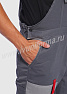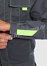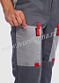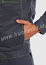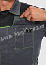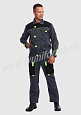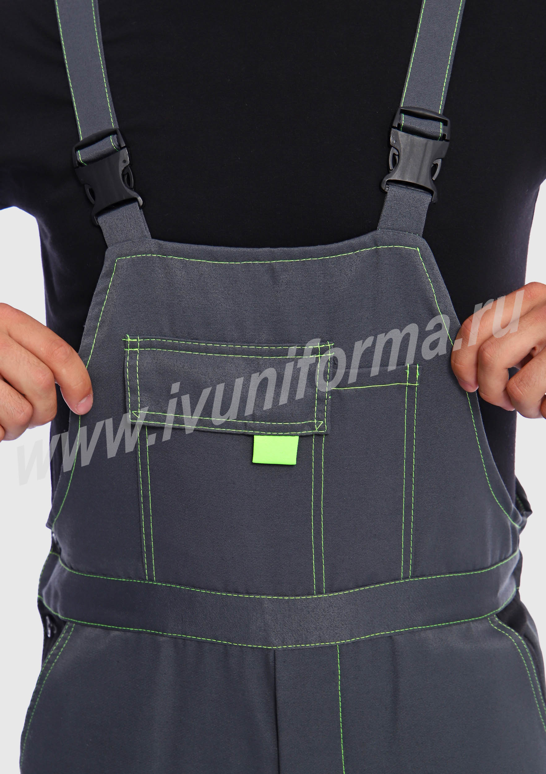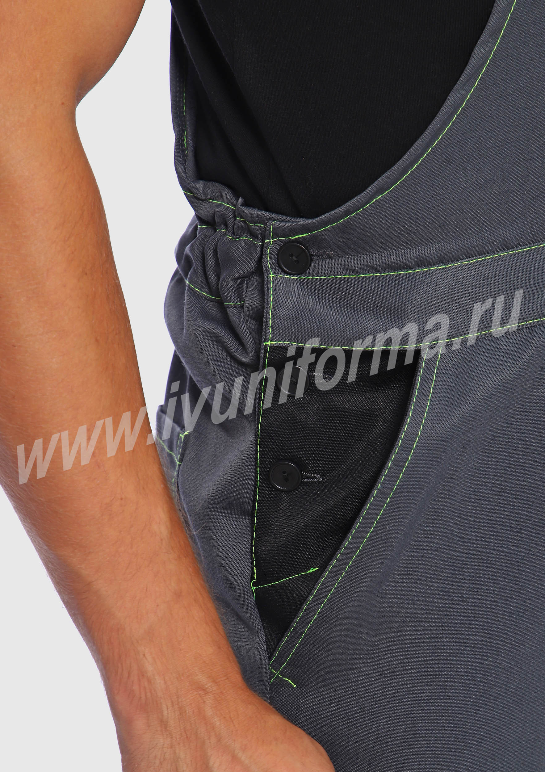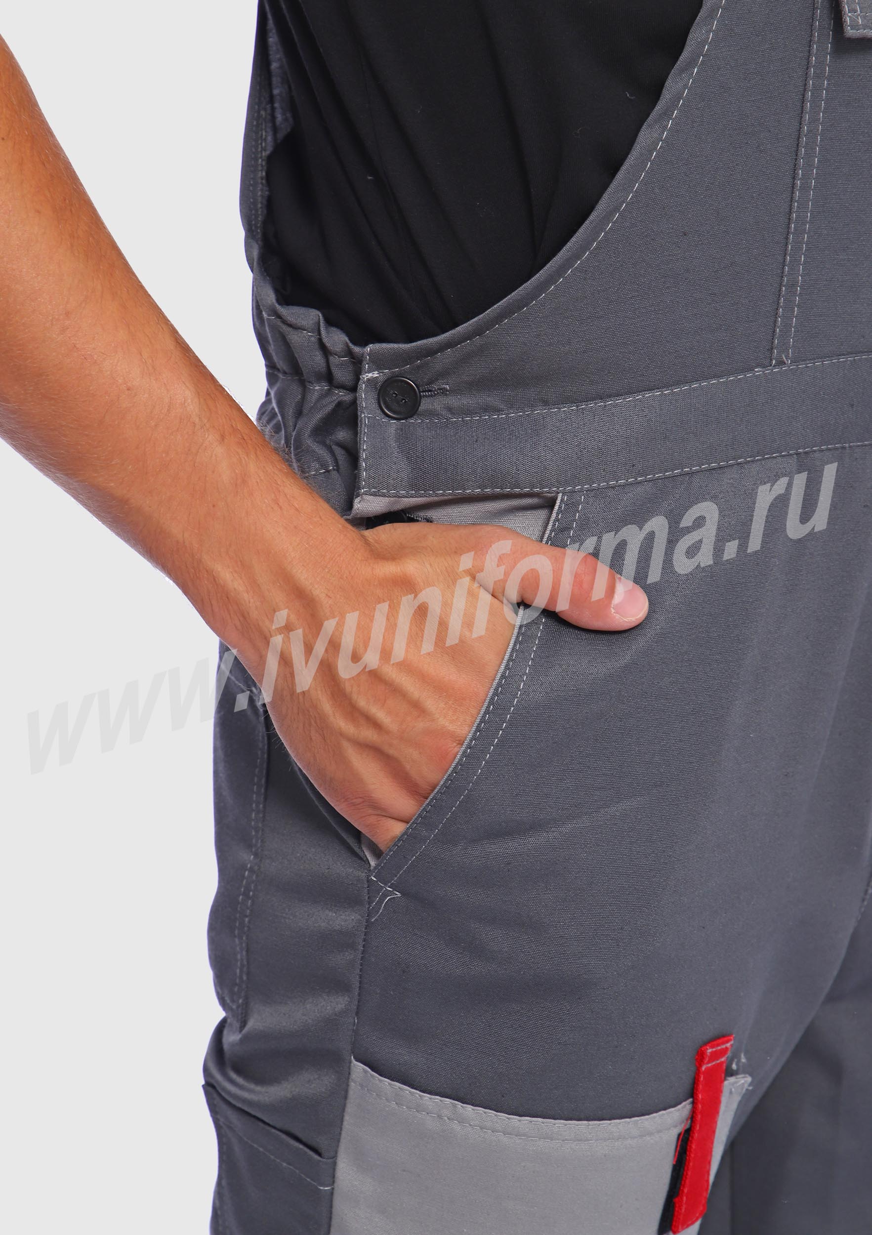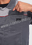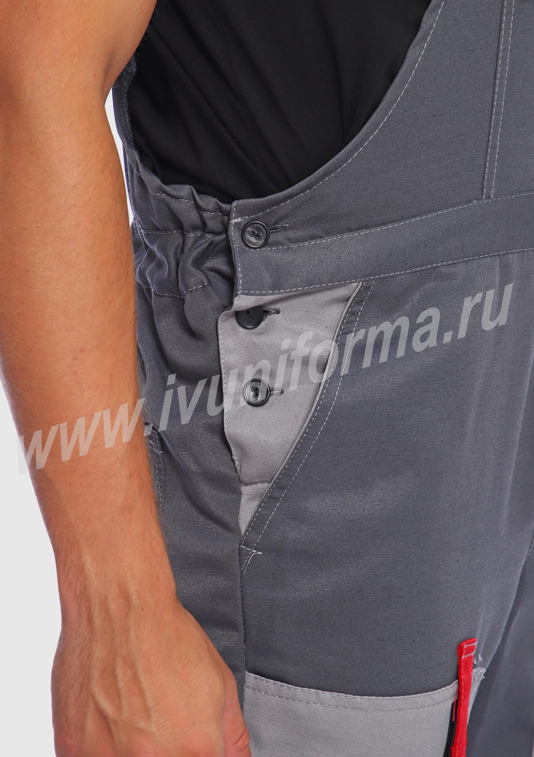 Костюм рабочий мужской состоит из куртки и полукомбинезона. Куртка с притачным поясом, стянутым по бокам эластичной лентой, с отложным воротником, с потайной застежкой на молнию, с нагрудным и двумя накладными боковыми карманами. Полукомбинезон с накладными и нагрудным карманами. Костюм усилен налокотниками и наколенниками, предназначен для защиты от общепроизводственных загрязнений и производственных травм.